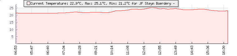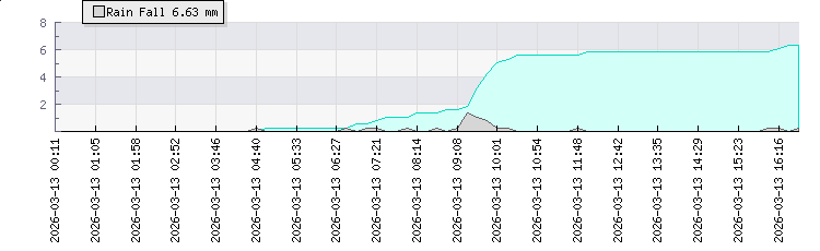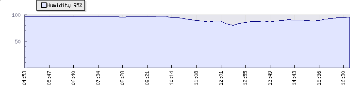 | Wind Gust: | 11 km/h | Min Temp: | 22.2 °C | Max Temp: | 26.1 °C | | Wind Average: | 6 km/h | Min Hum: | 80 % | Max Hum: | 97 % | |  |