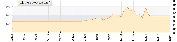 In the last few minutes the wind was Southerly at an average speed of 1 mph, reaching up to 1 mph and a low of 0 mph. The gust strength is1 mph above the minimum speed |