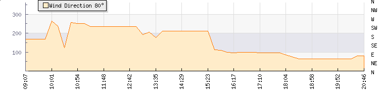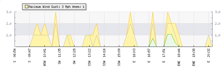 In the last few minutes the wind was East North East at an average speed of 0 mph, reaching up to 0 mph and a low of 0 mph. The gust strength is0 mph above the minimum speed |
