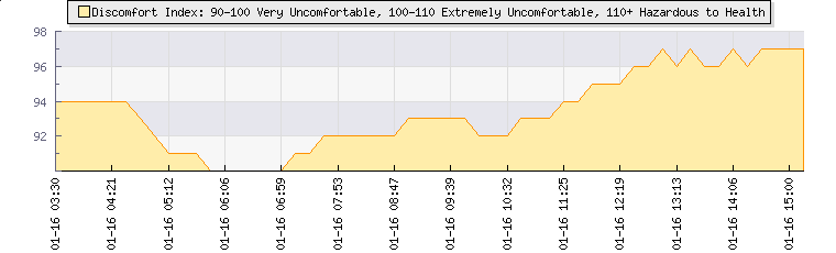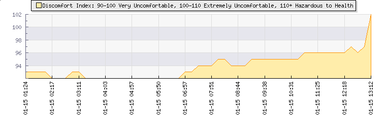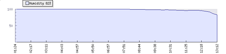 | Wind Gust: | 1 mph | Min Temp: | 23.5 °C | Max Temp: | 25.3 °C | | Wind Average: | 1 mph | Min Hum: | 96 % | Max Hum: | 100 % | |  |