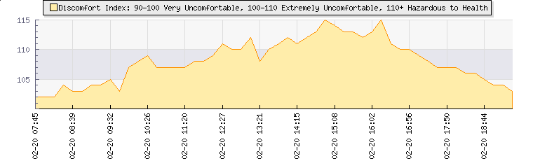 | Wind Speed: | 1|2|4 mph | Wind Direction: | E 85° | Temperature: | 32.5°C | | Wet Bulb: | 26.9°C | Discomfort: | 110 | Humidity: | 64% | | Rainfall Today: | 0mm | 12 hrs Rainfall: | 0mm | 24 hrs Rainfall: | 0mm | | Barometer: | 1011.2mb | Dew Point: | 24.7°C | Clouds AGL: | 3083ft (940 m) | | Density-Alt: | 3238ft (987 m) | Fire Danger: | |