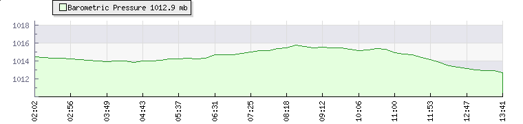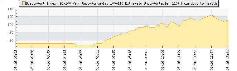 | Wind Speed: | 0|1|1 mph | Wind Direction: | S 189° | Temperature: | 31.4°C | | Wet Bulb: | 25.8°C | Discomfort: | 107 | Humidity: | 63% | | Rainfall Today: | 0mm | 12 hrs Rainfall: | 0mm | 24 hrs Rainfall: | 0.5mm | | Barometer: | 1013.7mb | Dew Point: | 23.5°C | Clouds AGL: | 3165ft (965 m) | | Density-Alt: | 3015ft (919 m) | Solar Radiation: | 1021Wm² | Fire Danger: | |