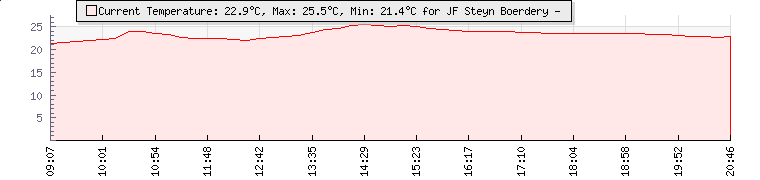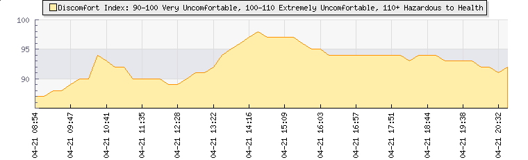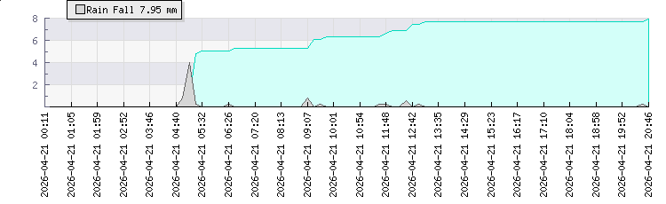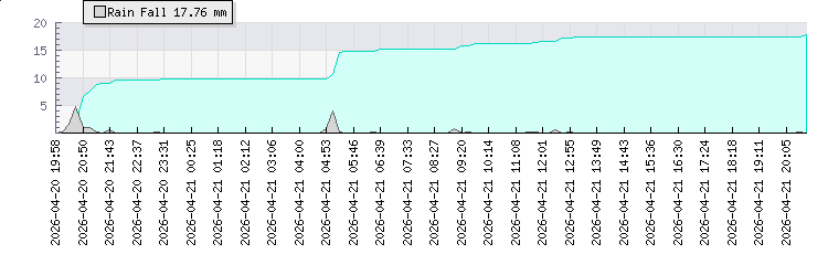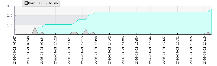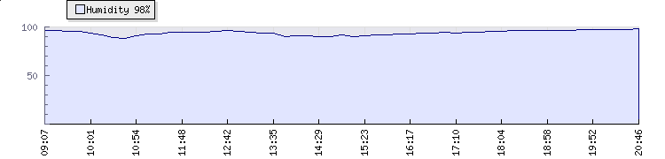 | Wind Gust: | 3 mph | Min Temp: | 21.3 °C | Max Temp: | 26.5 °C | | Wind Average: | 2 mph | Min Hum: | 88 % | Max Hum: | 97 % | |  |