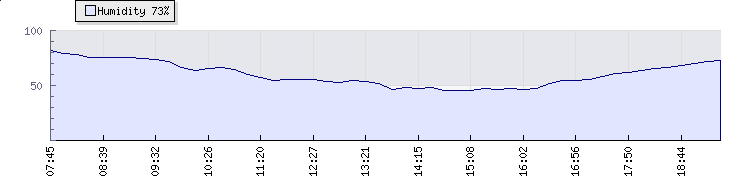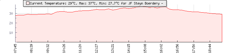 | Wind Gust: | 5 mph | Min Temp: | 24.1 °C | Max Temp: | 38 °C | | Wind Average: | 3 mph | Min Hum: | 45 % | Max Hum: | 95 % | |  |