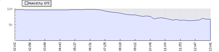 | Wind Gust: | 3 mph | Min Temp: | 22.2 °C | Max Temp: | 31.4 °C | | Wind Average: | 2 mph | Min Hum: | 63 % | Max Hum: | 98 % | |  |