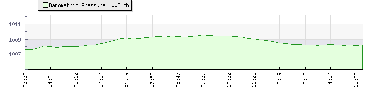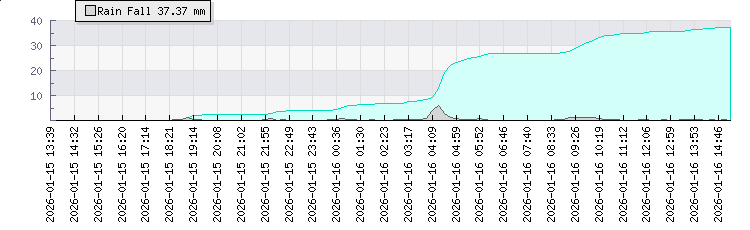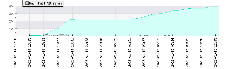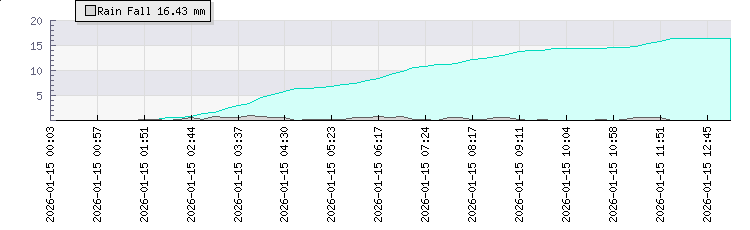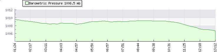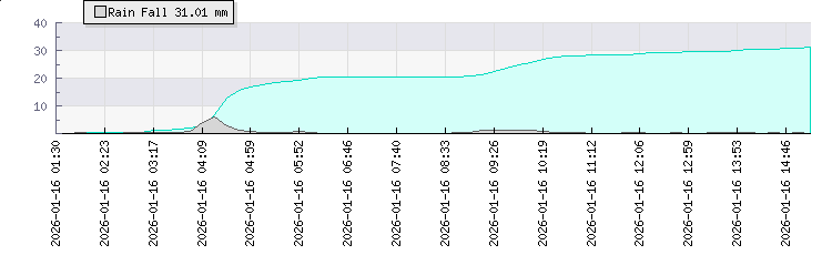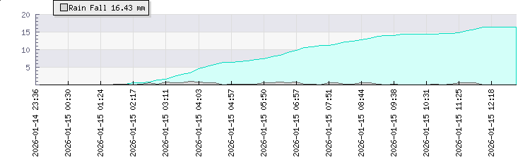 | Wind Speed: | 0|0|0 mph | Wind Direction: | E 79° | Temperature: | 25.3°C | | Wet Bulb: | 24.8°C | Discomfort: | 99 | Humidity: | 96% | | Rainfall Today: | 15.4mm | 12 hrs Rainfall: | 15.4mm | 24 hrs Rainfall: | 38.2mm | | Barometer: | 1008.1mb | Dew Point: | 24.6°C | Clouds AGL: | 274ft (84 m) | | Density-Alt: | 2536ft (773 m) | Solar Radiation: | 515Wm² | Fire Danger: | |
