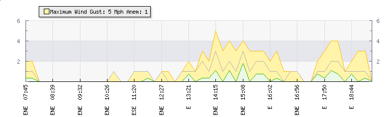 In the last few minutes the wind was Easterly at an average speed of 2 mph, reaching up to 4 mph and a low of 1 mph. The gust strength is3 mph above the minimum speed |