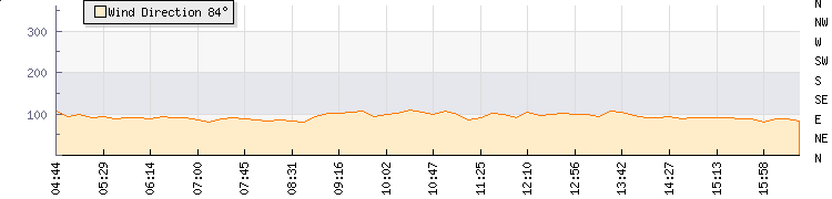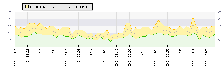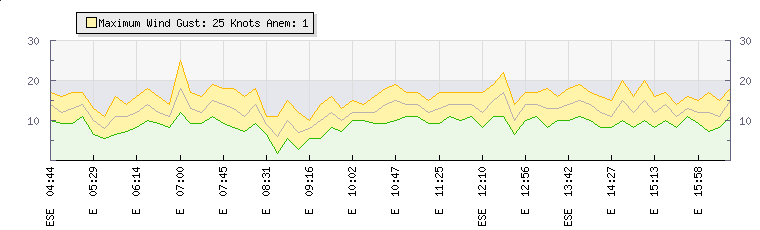 In the last few minutes the wind was Easterly at an average speed of 11 knots, reaching up to 15 knots and a low of 8 knots. The gust strength is7 knots above the minimum speed |