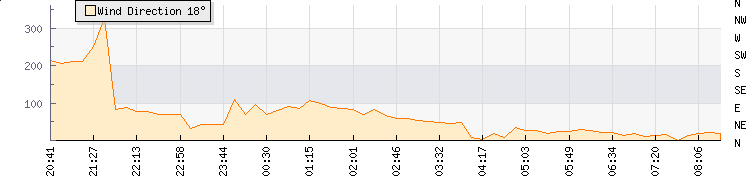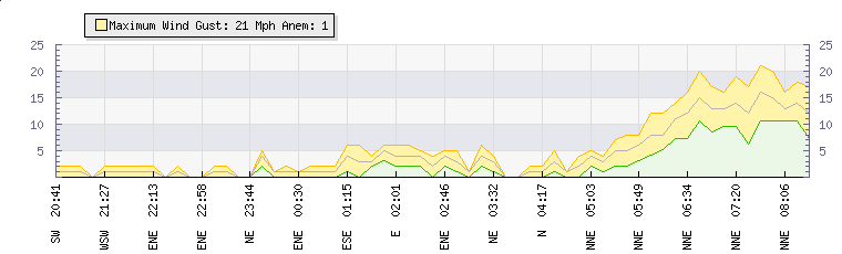 In the last few minutes the wind was North North East at an average speed of 3 mph, reaching up to 4 mph and a low of 1 mph. The gust strength is3 mph above the minimum speed |