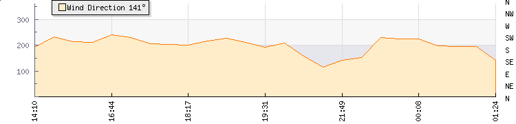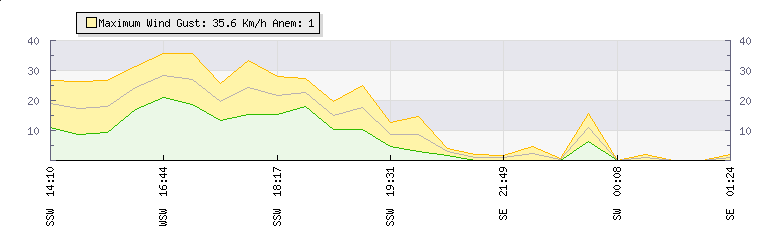 In the last few minutes the wind was South Westerly at an average speed of 11 kmh, reaching up to 16 kmh and a low of 6 kmh. The gust strength is10 kmh above the minimum speed |
