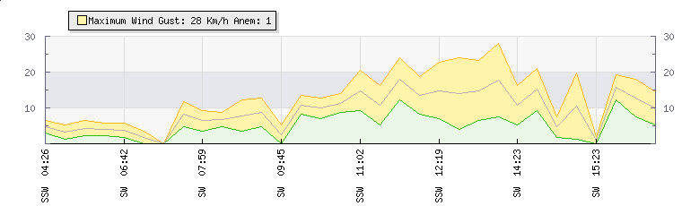 In the last few minutes the wind was West South West at an average speed of 5 kmh, reaching up to 8 kmh and a low of 2 kmh. The gust strength is6 kmh above the minimum speed |