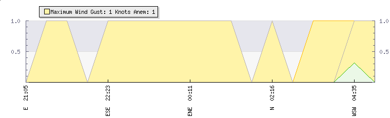 In the last few minutes the wind was South Easterly at an average speed of 1 knots, reaching up to 1 knots and a low of 0 knots. The gust strength is1 knots above the minimum speed |