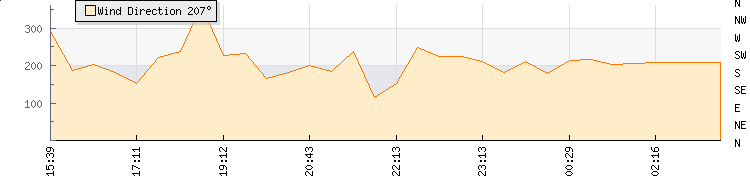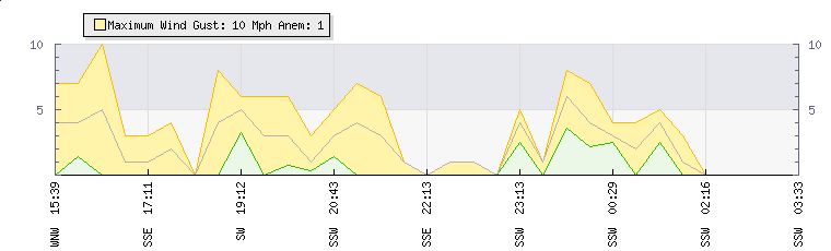 In the last few minutes the wind was South South West at an average speed of 1 mph, reaching up to 3 mph and a low of 0 mph. The gust strength is3 mph above the minimum speed |