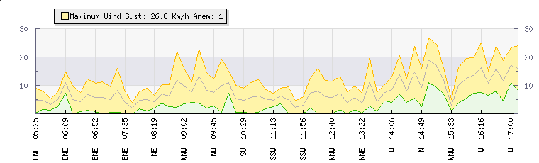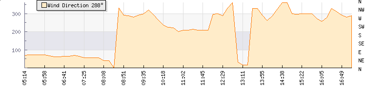 In the last few minutes the wind was Northerly at an average speed of 9 kmh, reaching up to 16 kmh and a low of 3 kmh. The gust strength is13 kmh above the minimum speed |