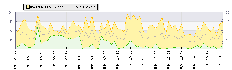 In the last few minutes the wind was West South West at an average speed of 4 kmh, reaching up to 8 kmh and a low of 0 kmh. The gust strength is8 kmh above the minimum speed |
