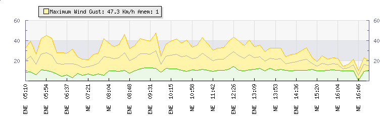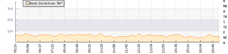 In the last few minutes the wind was North Easterly at an average speed of 17 kmh, reaching up to 23 kmh and a low of 11 kmh. The gust strength is12 kmh above the minimum speed |