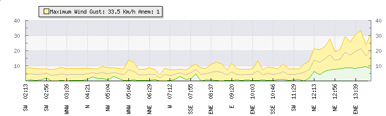 In the last few minutes the wind was East North East at an average speed of 15 kmh, reaching up to 23 kmh and a low of 6 kmh. The gust strength is17 kmh above the minimum speed |