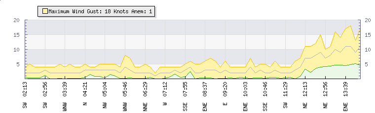 In the last few minutes the wind was East North East at an average speed of 8 knots, reaching up to 12 knots and a low of 3 knots. The gust strength is9 knots above the minimum speed |