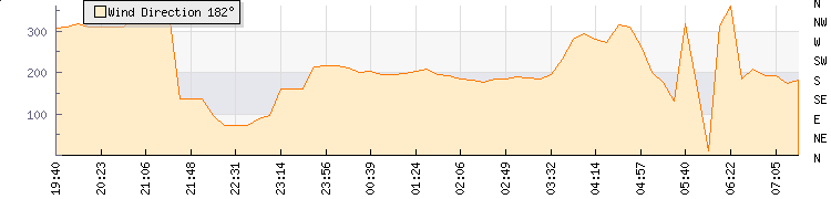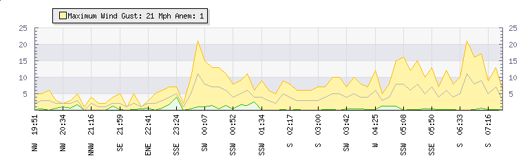 In the last few minutes the wind was South Easterly at an average speed of 2 mph, reaching up to 5 mph and a low of 0 mph. The gust strength is5 mph above the minimum speed |