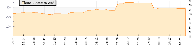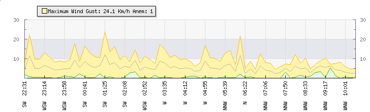 In the last few minutes the wind was West North West at an average speed of 5 kmh, reaching up to 8 kmh and a low of 2 kmh. The gust strength is6 kmh above the minimum speed |