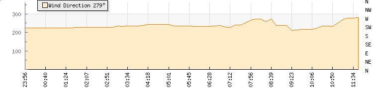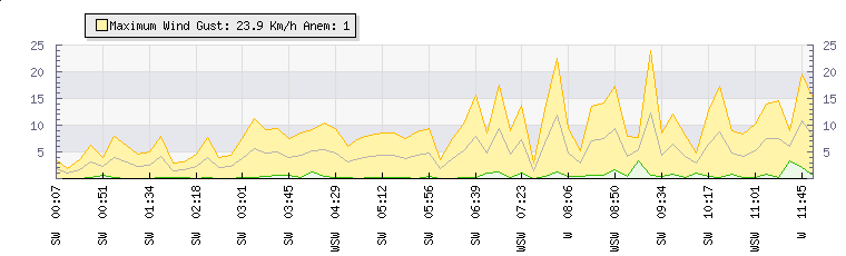 In the last few minutes the wind was South Westerly at an average speed of 6 kmh, reaching up to 13 kmh and a low of 0 kmh. The gust strength is13 kmh above the minimum speed |