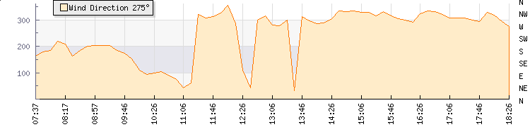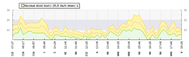 In the last few minutes the wind was North North West at an average speed of 9 kmh, reaching up to 14 kmh and a low of 5 kmh. The gust strength is9 kmh above the minimum speed |