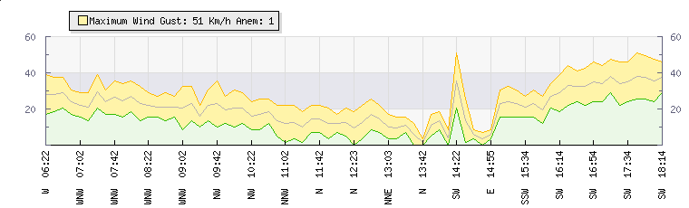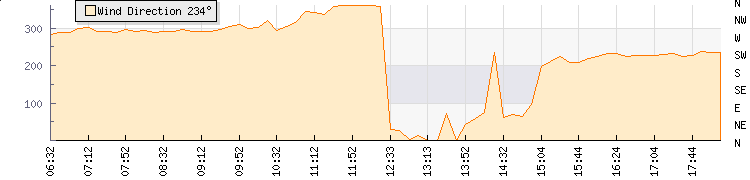 In the last few minutes the wind was South Westerly at an average speed of 32 kmh, reaching up to 43 kmh and a low of 22 kmh. The gust strength is21 kmh above the minimum speed |