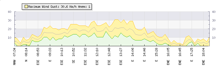 In the last few minutes the wind was East North East at an average speed of 2 kmh, reaching up to 3 kmh and a low of 0 kmh. The gust strength is3 kmh above the minimum speed |