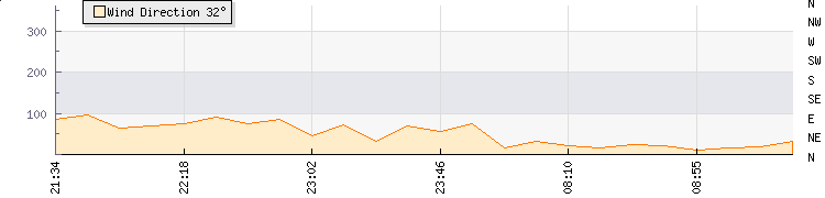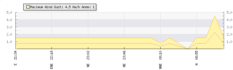In the last few minutes the wind was East North East at an average speed of 1 kmh, reaching up to 2 kmh and a low of 0 kmh. The gust strength is2 kmh above the minimum speed |