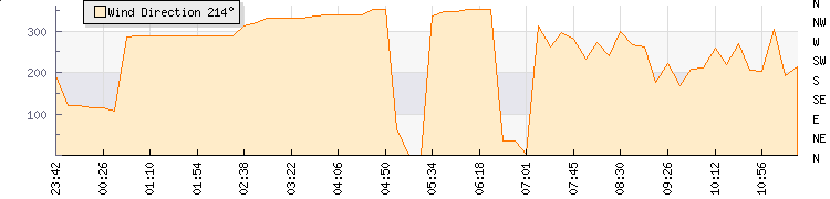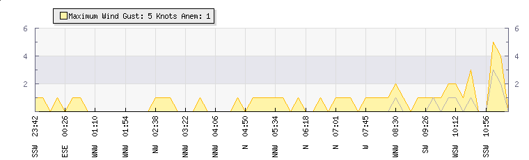 In the last few minutes the wind was West South West at an average speed of 1 knots, reaching up to 2 knots and a low of 0 knots. The gust strength is2 knots above the minimum speed |