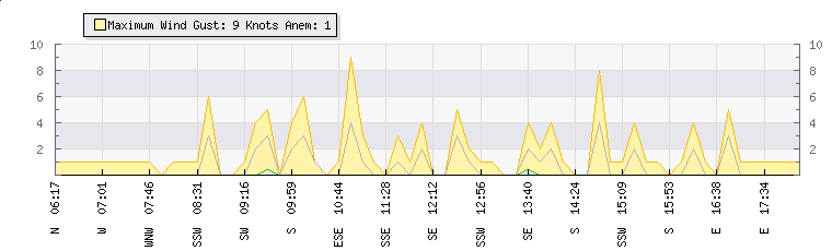 In the last few minutes the wind was East South East at an average speed of 5 knots, reaching up to 11 knots and a low of 0 knots. The gust strength is11 knots above the minimum speed |