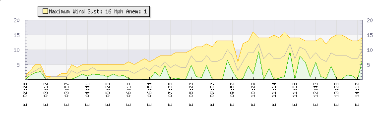 Wind Gust: | 16 mph | Min Temp: | 13 °C | Max Temp: | 29.3 °C | Wind Average: | 12 mph | Min Hum: | 10 % | Max Hum: | 10 % | |  |