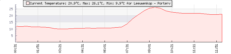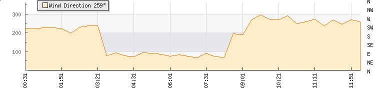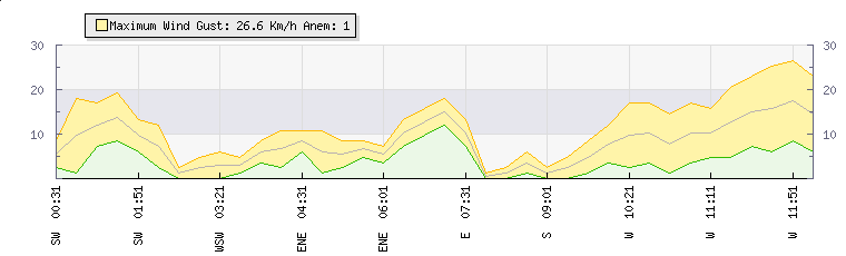 | Wind Gust: | 19 km/h | Min Temp: | 9.9 °C | Max Temp: | 26.1 °C | | Wind Average: | 15 km/h | Min Hum: | 61 % | Max Hum: | 80 % | |  |