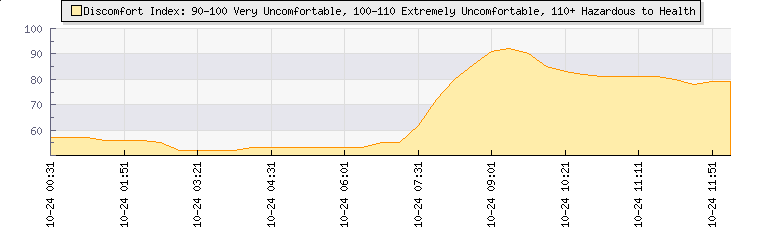 | Wind Speed: | 0|2|5 kmh | Wind Direction: | W 270° | Temperature: | 26.1°C | | Wet Bulb: | 20.6°C | Discomfort: | 92 | Humidity: | 61% | | Barometer: | 1012.7mb | Dew Point: | 18°C | Clouds AGL: | 3249ft (990 m) | | Density-Alt: | 4508ft (1374 m) | Fire Danger: | |