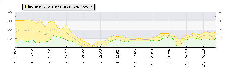 In the last few minutes the wind was East North East at an average speed of 11 kmh, reaching up to 13 kmh and a low of 8 kmh. The gust strength is5 kmh above the minimum speed |
