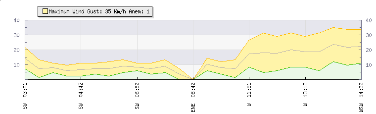 In the last few minutes the wind was Westerly at an average speed of 19 kmh, reaching up to 29 kmh and a low of 8 kmh. The gust strength is21 kmh above the minimum speed |