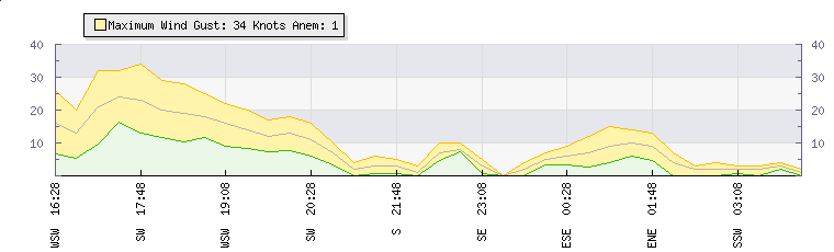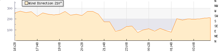 | Wind Gust: | 15 knots | Min Temp: | 22.7 °C | Max Temp: | 24.1 °C | | Wind Average: | 10 knots | Min Hum: | 47 % | Max Hum: | 51 % | |  |