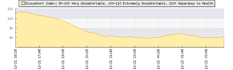 | Wind Speed: | 0|2|3 knots | Wind Direction: | S 190° | Temperature: | 23°C | | Wet Bulb: | 16.3°C | Discomfort: | 82 | Humidity: | 50% | | Barometer: | 1005mb | Dew Point: | 12°C | Clouds AGL: | 4397ft (1340 m) | | Density-Alt: | 4334ft (1321 m) | Fire Danger: | |