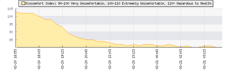 | Wind Speed: | 5|6|8 knots | Wind Direction: | ENE 73° | Temperature: | 23.2°C | | Wet Bulb: | 15.4°C | Discomfort: | 80 | Humidity: | 43% | | Barometer: | 1013.5mb | Dew Point: | 9.9°C | Clouds AGL: | 5313ft (1619 m) | | Density-Alt: | 4045ft (1233 m) | Fire Danger: | |