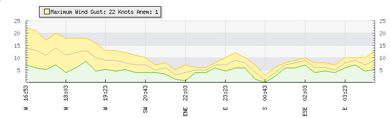 In the last few minutes the wind was East North East at an average speed of 6 knots, reaching up to 8 knots and a low of 5 knots. The gust strength is3 knots above the minimum speed |