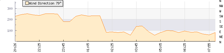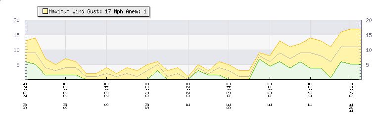 In the last few minutes the wind was East North East at an average speed of 11 mph, reaching up to 17 mph and a low of 5 mph. The gust strength is12 mph above the minimum speed |