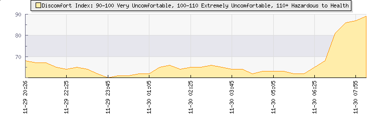 | Wind Speed: | 5|11|17 mph | Wind Direction: | ENE 59° | Temperature: | 25.2°C | | Wet Bulb: | 18.3°C | Discomfort: | 87 | Humidity: | 51% | | Barometer: | 1012mb | Dew Point: | 14.3°C | Clouds AGL: | 4347ft (1325 m) | | Density-Alt: | 4373ft (1333 m) | Fire Danger: | |