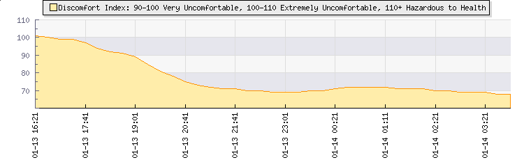 | Wind Speed: | 2|4|5 mph | Wind Direction: | S 188° | Temperature: | 18.2°C | | Wet Bulb: | 12.8°C | Discomfort: | 70 | Humidity: | 55% | | Barometer: | 1008.8mb | Dew Point: | 9°C | Clouds AGL: | 3678ft (1121 m) | | Density-Alt: | 3629ft (1106 m) | Fire Danger: | |