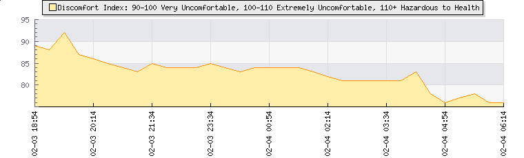 | Wind Speed: | 2|6|11 mph | Wind Direction: | NNE 22° | Temperature: | 21°C | | Wet Bulb: | 15.8°C | Discomfort: | 78 | Humidity: | 59% | | Barometer: | 1013.8mb | Dew Point: | 12.7°C | Clouds AGL: | 3330ft (1015 m) | | Density-Alt: | 3822ft (1165 m) | Fire Danger: | |