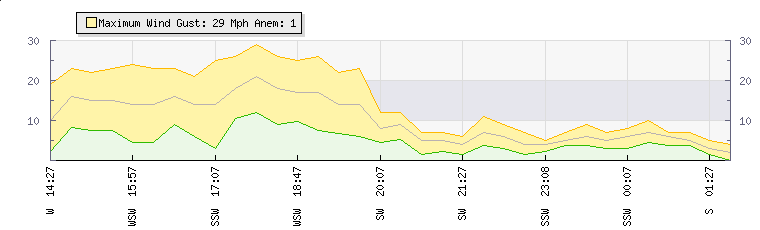 | Wind Gust: | 24 mph | Min Temp: | 9.6 °C | Max Temp: | 30.9 °C | | Wind Average: | 16 mph | Min Hum: | 28 % | Max Hum: | 59 % | |  |
