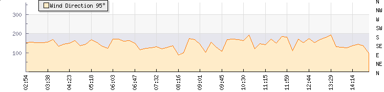 In the last few minutes the wind was South Easterly at an average speed of 14 kmh, reaching up to 20 kmh and a low of 9 kmh. The gust strength is11 kmh above the minimum speed |