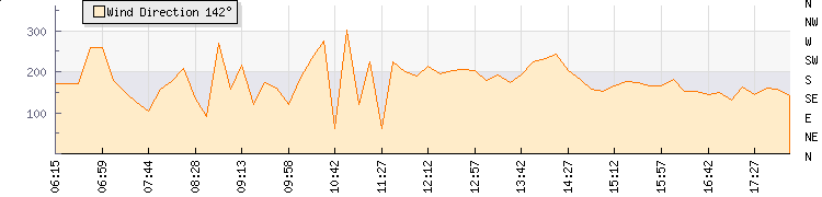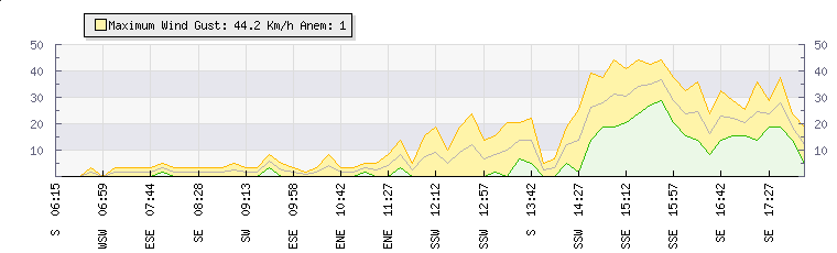 In the last few minutes the wind was South Easterly at an average speed of 20 kmh, reaching up to 26 kmh and a low of 15 kmh. The gust strength is11 kmh above the minimum speed |