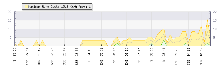 In the last few minutes the wind was Northerly at an average speed of 3 kmh, reaching up to 5 kmh and a low of 0 kmh. The gust strength is5 kmh above the minimum speed |