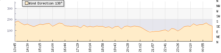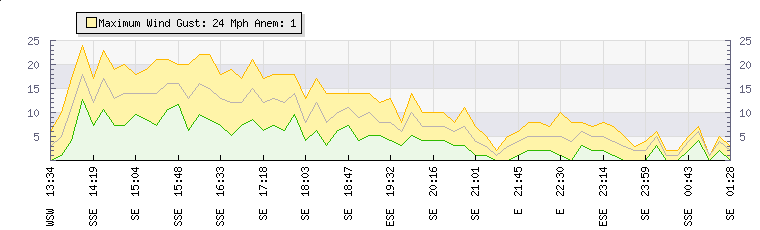 In the last few minutes the wind was South Easterly at an average speed of 5 mph, reaching up to 6 mph and a low of 3 mph. The gust strength is3 mph above the minimum speed |