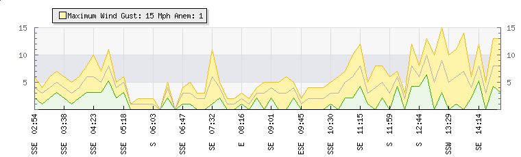 In the last few minutes the wind was South Easterly at an average speed of 9 mph, reaching up to 13 mph and a low of 5 mph. The gust strength is8 mph above the minimum speed |